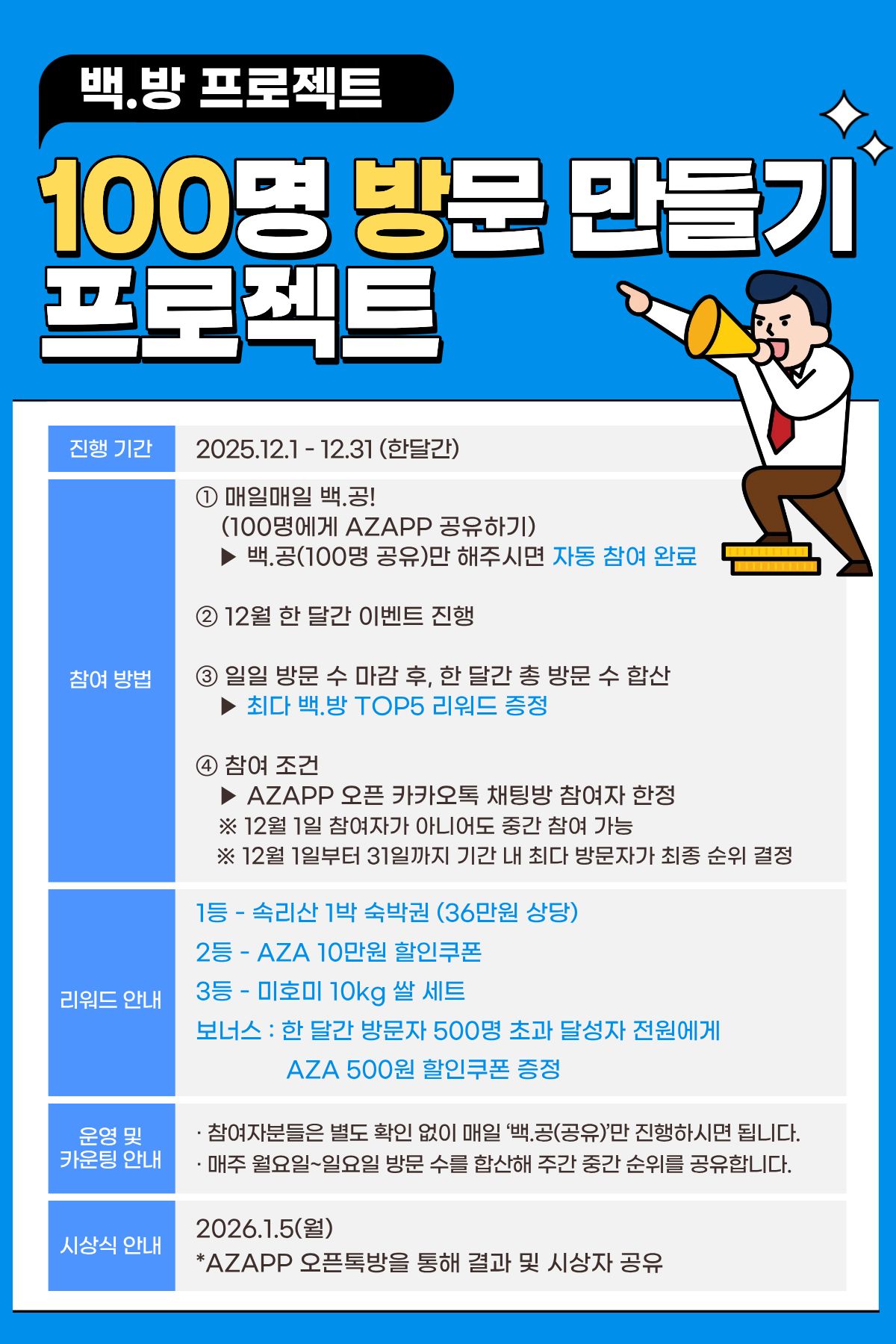 공지사항 공지사항 공지사항 [AZAPP] 백.방 (100명 방문 만들기) 프로젝트 작성자 이서연 조회수 14 작성일 2025.11.18 https://open.kakao.com/o/gzYrcAOh 이전 수정 목록